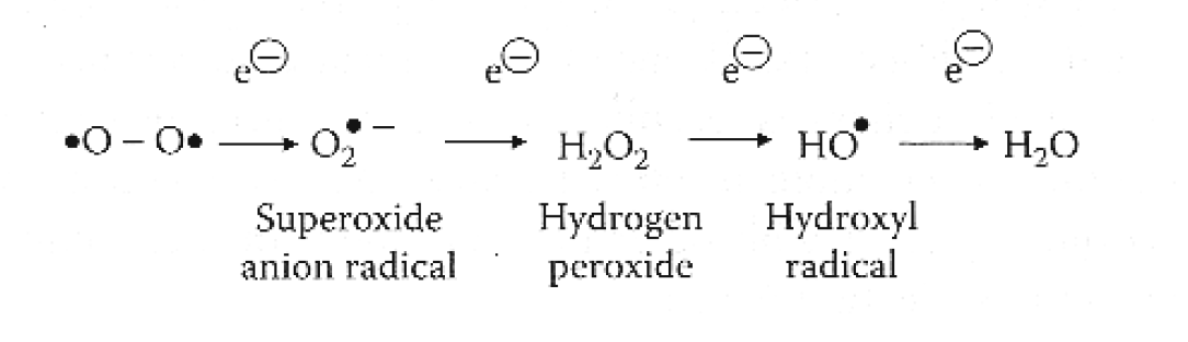 Draw the step wise reduction of molecular oxygen in biological systems: