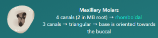maxillary molars are more triangular-shaped due to them having 3 roots and an oblique ridge, so their access preps will be somewhat triangular.