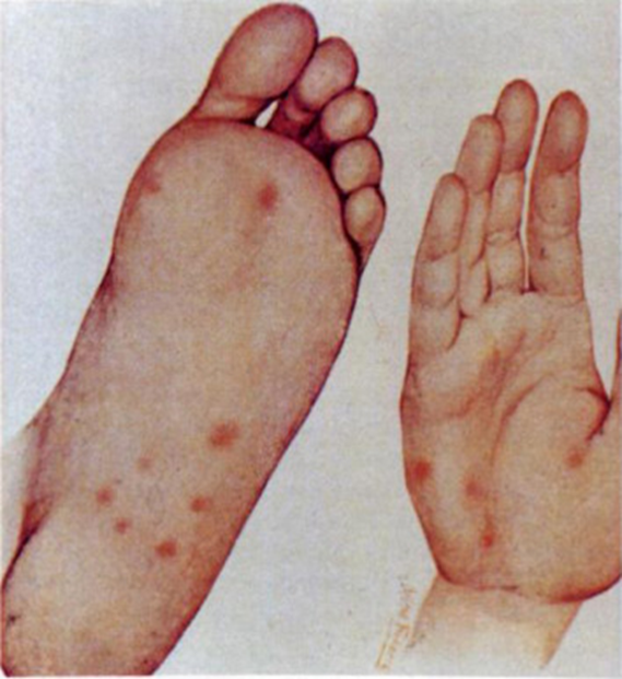 Painless (micro-abscesses), erythematous lesions on palms and soles.