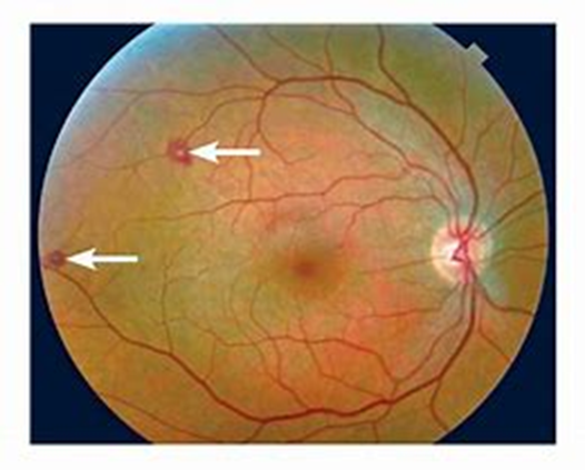 (e) Roth spots: Exudative lesions in the retina; occurs in 25% of patients