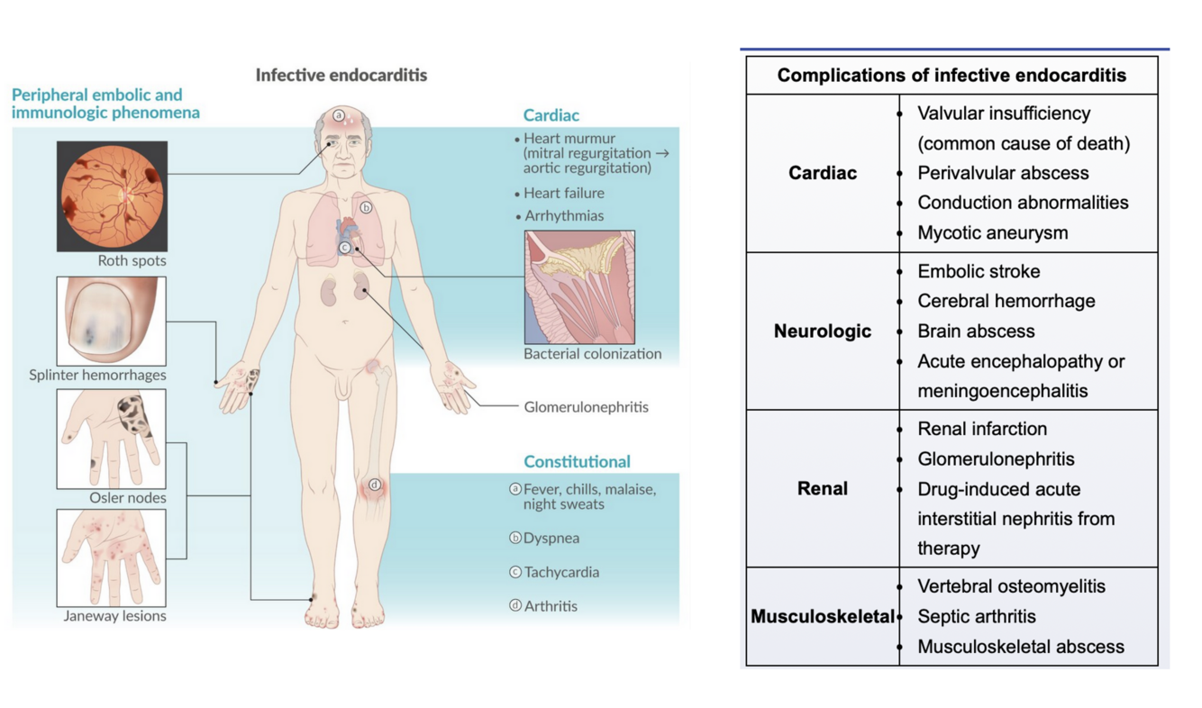 Septic emboli (e.g., strokes, pulmonary infarcts)