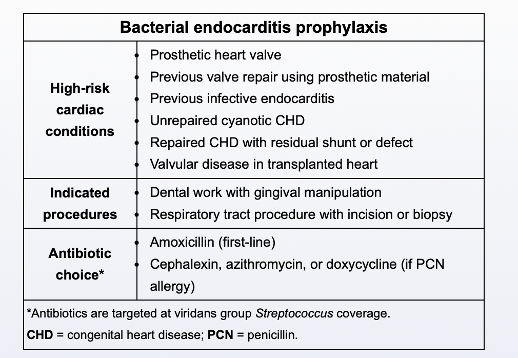 Explanation: Patients with cyanotic congenital heart disease are at risk for endocarditis, particularly with dental procedures. Amoxicillin is the first-line prophylactic antibiotic for Viridans streptococci.