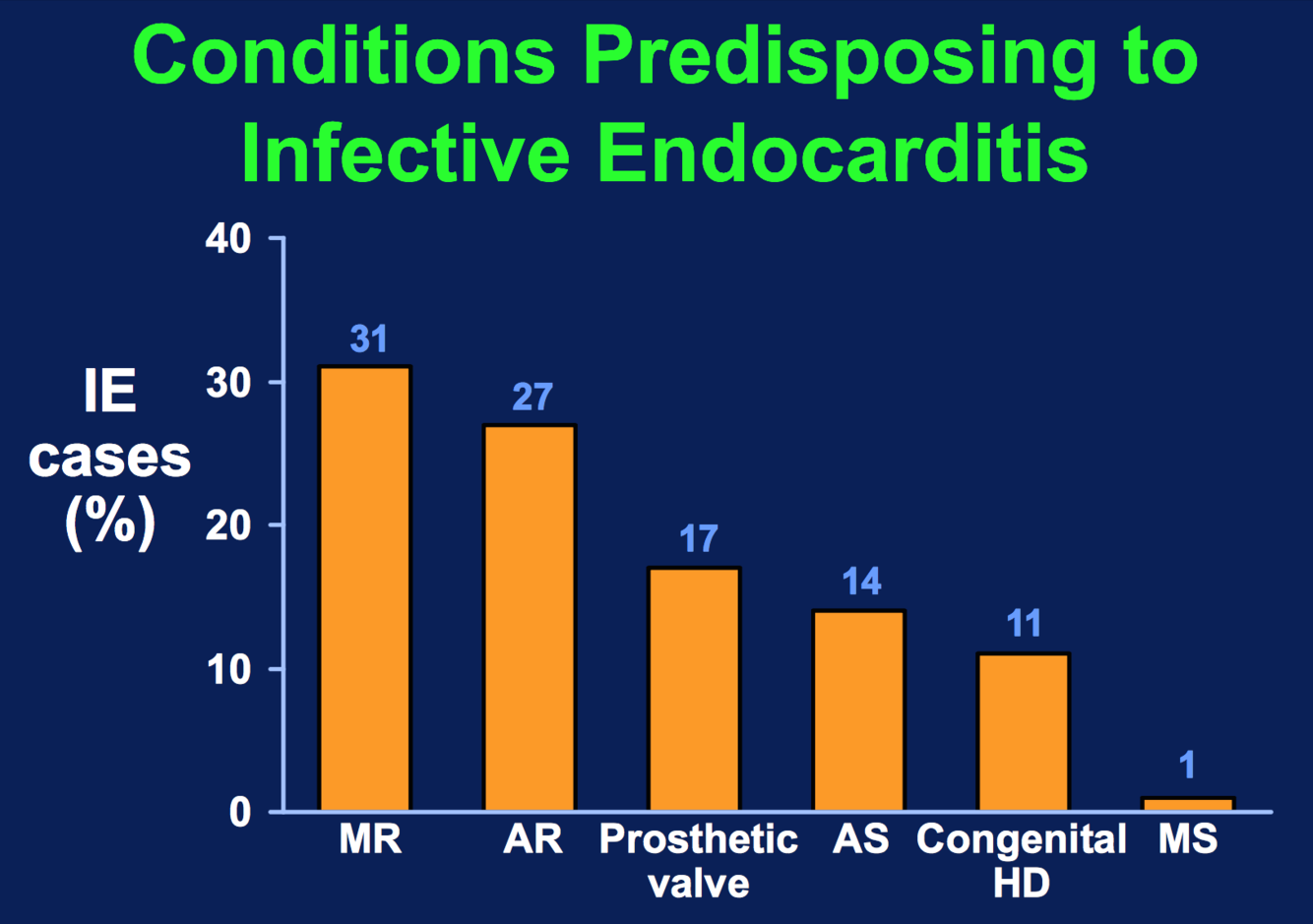 staph aureus, strep viridans, bovis enteroccocci, HACEK + staph epi, GN bacilli