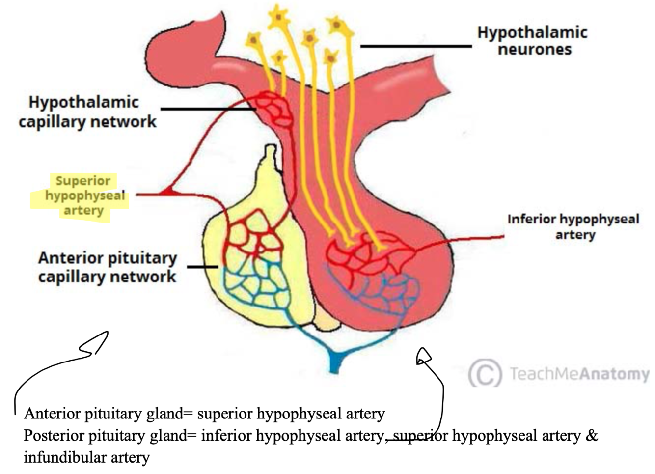 The superior hypophysial artery enters into the substance of the hypothalamus before breaking up into capillaries (the hypophysial portal system). These capillaries then supply the anterior pituitary gland.