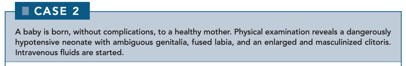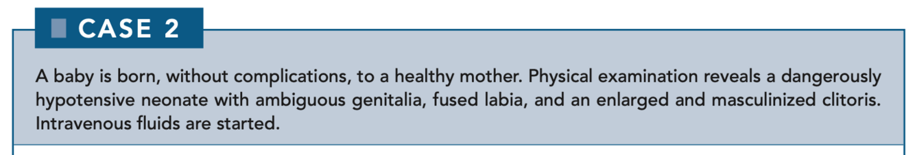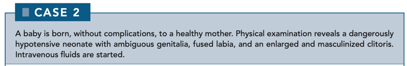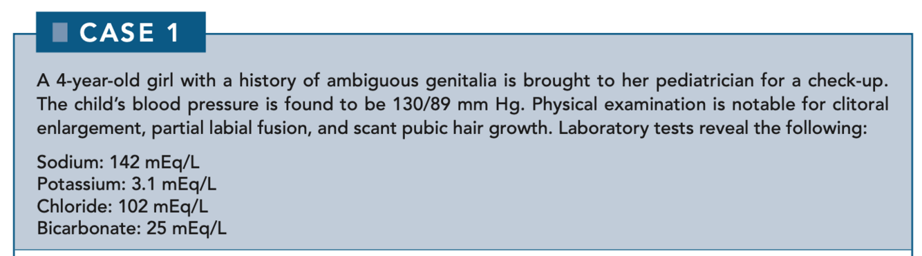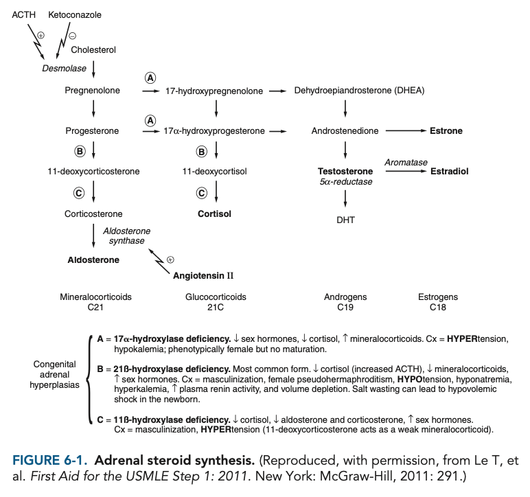 21β-Hydroxylase deficiency presents with hypotension and hyperkalemia. Both deficiencies present with masculinization of the external genitalia. A review of adrenal steroid synthesis is shown in Figure 6-1.
