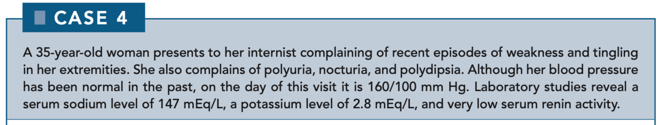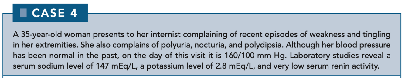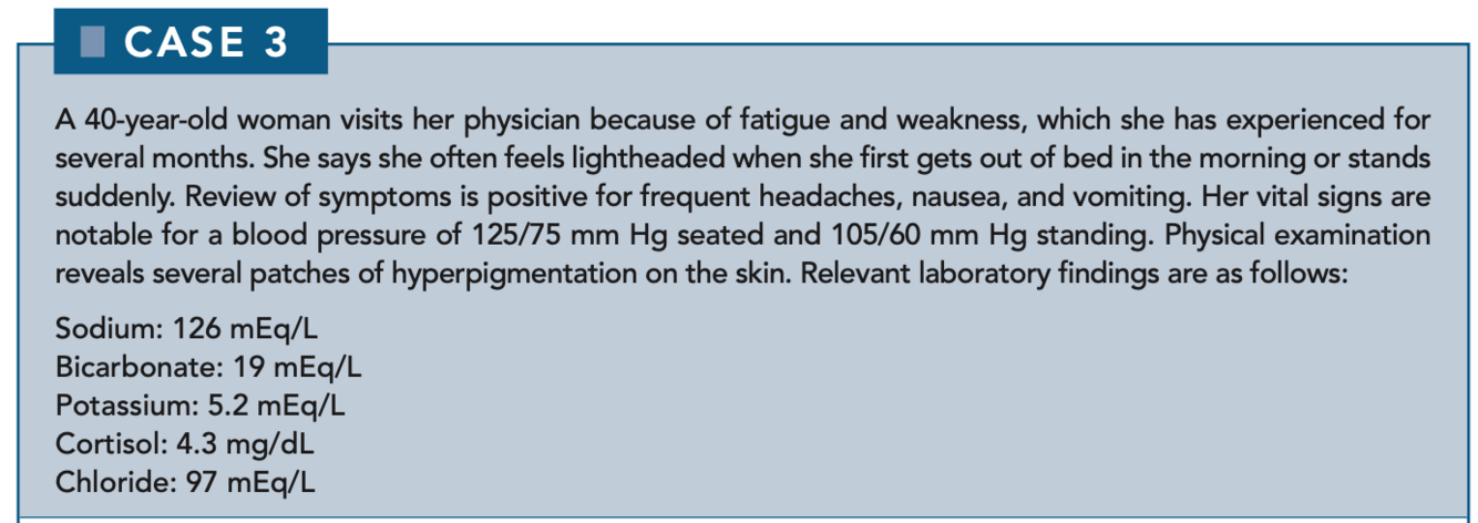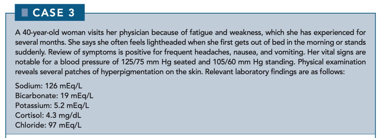 Hyponatremia and hyperkalemia are likely because mineralocorticoids (which are low in these patients) are responsible for the retention of sodium and the excretion of potassium. Salt wasting causes hypotension, which leads to activation of the renin-angiotensin system, resulting in elevated serum renin levels.