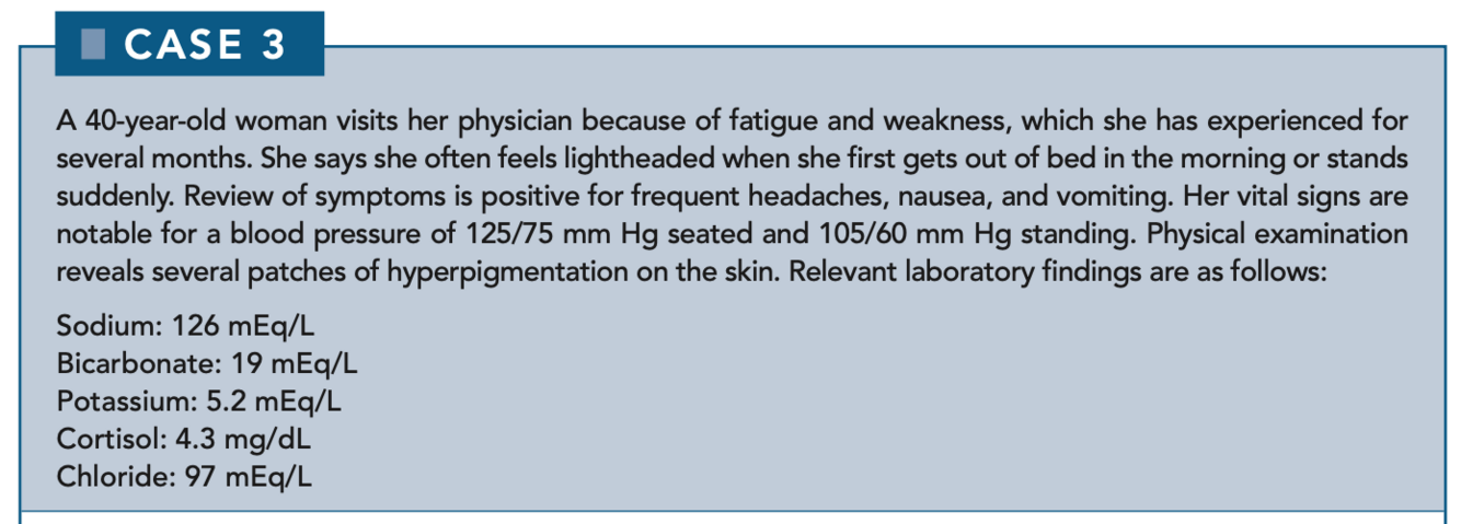 Addison disease, or primary adrenal insufficiency, is suggested by the clinical history of weakness and orthostatic hypotension and by the signs of hyperpigmentation, hyponatremia, hyperkalemia, and a low serum cortisol level.