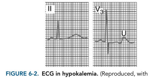 Typical ECG findings include prominent U waves, flattened T waves, and ST-segment depression (Figure 6-2).