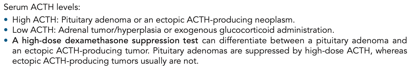 2. Dexamethasone suppression test. A normal result is a decrease in cortisol after administration of low- dose dexamethasone. In glucocorticoid excess due to Cushing disease, low-dose dexamethasone will