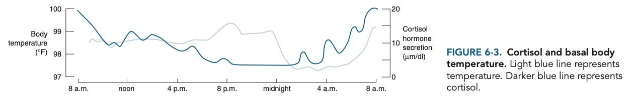 Cortisol levels peak in the early morning (approximately 8 AM) and reach their lowest levels at midnight. Basal body temperature fluctuates with the cortisol cycle (Figure 6-3).