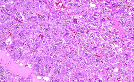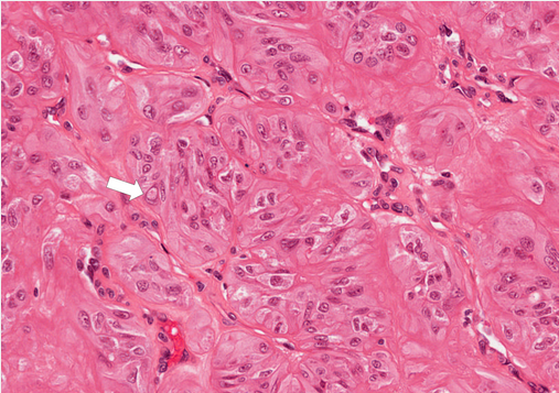 Image: The tumour cell nuclei are convoluted with prominent membrane irregularities that form grooves and pseudoinclusions (arrow).
