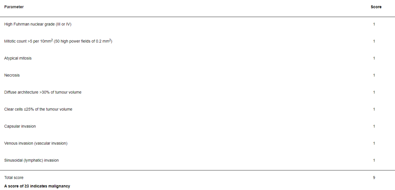 (iii) at least one of the following features: convoluted nuclei, mitotic count ≥ 3 per 2 mm2, tumour necrosis;