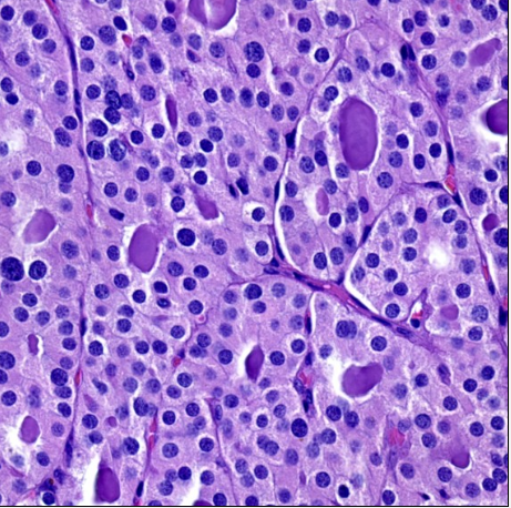 Histopathology: oncocytic (Hürthle cell) adenoma and carcinoma