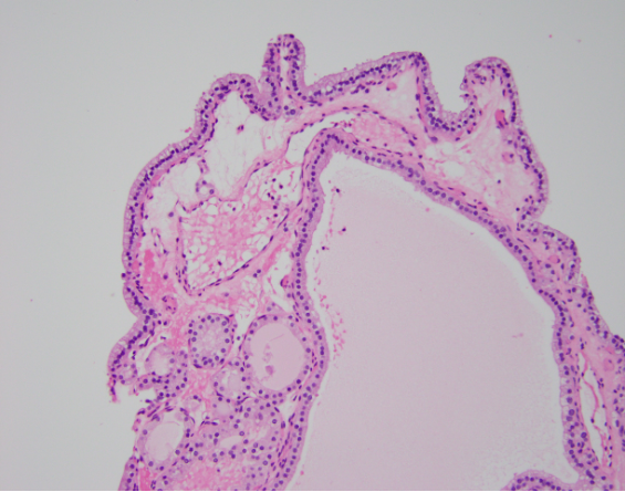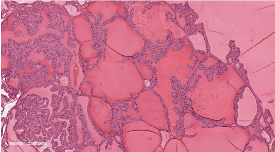 Below image; Follicular adenoma with papillary architecture - Low power view showing large colloid-filled follicles and complex papillary infoldings of the lining epithelium.