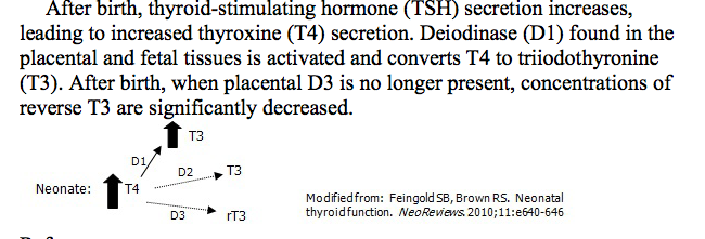 T3 - low until 30 weeks when fetus can convert T4 to active T3 (mature type 1 deiodinase) -> surge at birth -> peak 24 - 36 hrs -> T3 levels increase post natally b/c of neonate’s ability to convert T4 to active T3