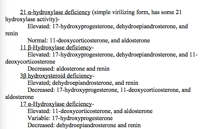 Review other abnormal lab values of enzymes deficiencies in adrenal steroidogenesis pathway