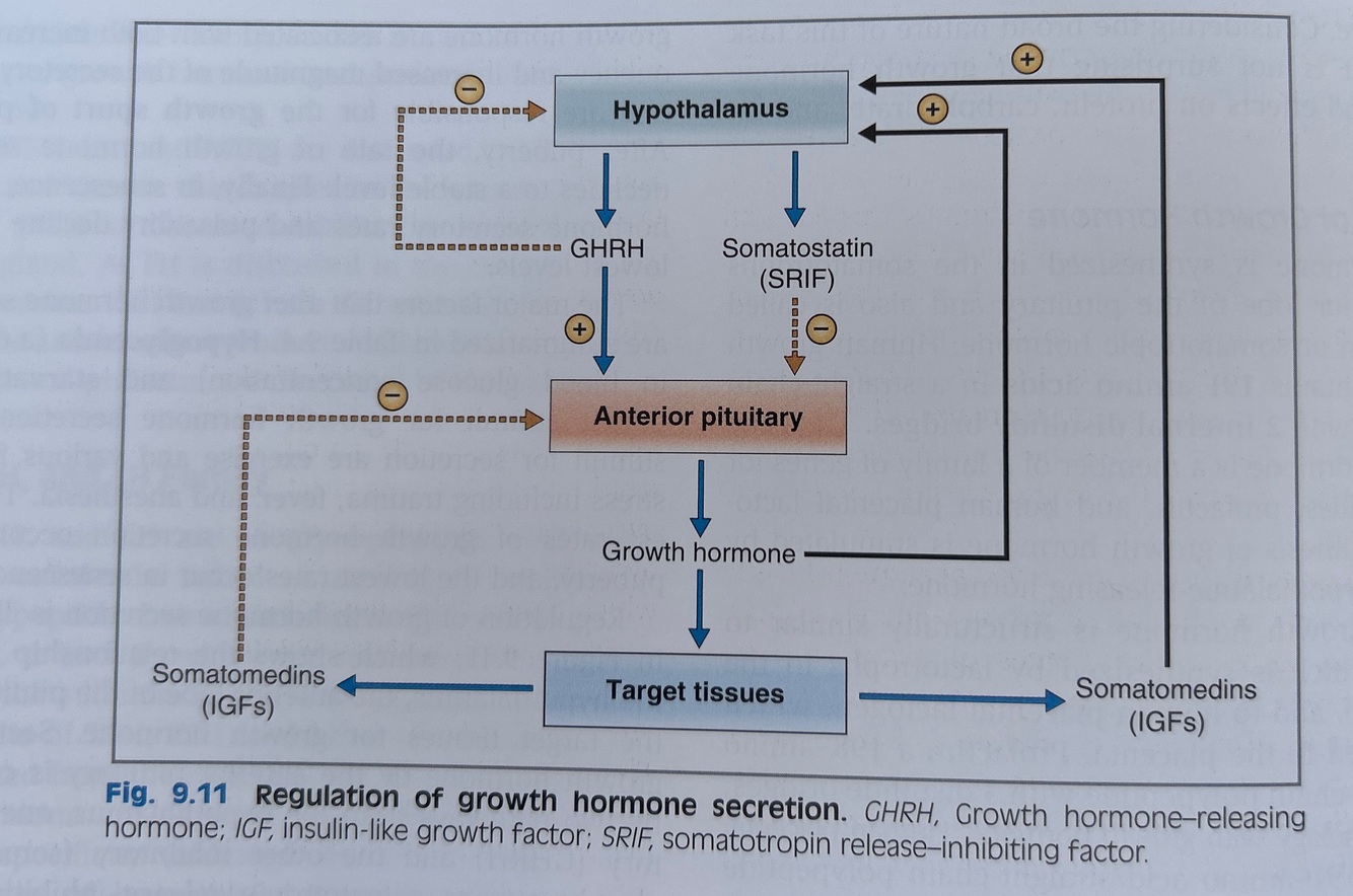 2) somatomedins (byproduct of GH action) on target tissue inhibit secretion of GH by the anterior pituitary