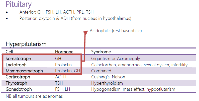Post - Vasopressin (ADH) and Oxytocin Ant - FLAT PiG (pig=acid) F-FSH L-LH A-ACTH T-TSH all basophil Prolactin GH both acidophil