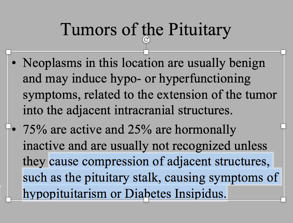 2. Tumors that destroy the pituitary or hypothalamus (ex: gliomas or Craniopharyngiomas)