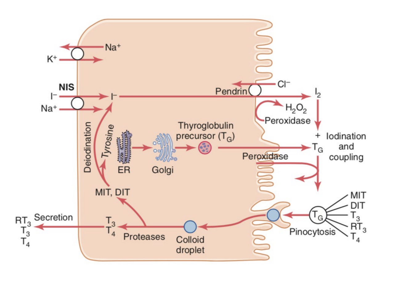 -NIS transports I across basolateral membrane, then transported across apical membrane via pendrin