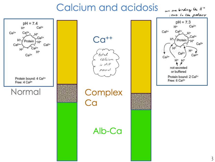 Acidosis - normal total Ca with increased Ca++ and decreased albumin bound