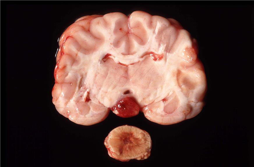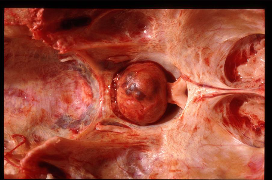 Pituitary - normal tissue has been destroyed and replaced with a round, diffusely reddened nodular, firm mass which is 2x3cm in size