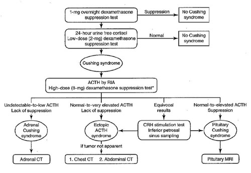 24-hour urine cortisol: This test is done to confirm that an overnight dexa-methasone suppression test is not falsely abnormal. The 24-hour urine cor-tisol adds specificity to the overnight test. If the overnight dexamethasone test is abnormal (fails to suppress), then get the 24-hour urine cortisol to confirm hypercortisolism (Cushing syndrome).