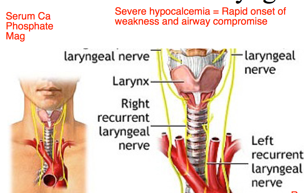 • Surgery on thyroid or parathyroid glands can result in damage to recurrent laryngeal nerve, airway swelling and hematoma formation