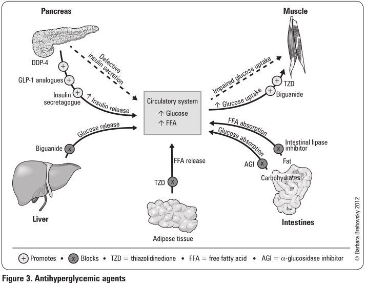 Where do the different antihyperglycaemia agent act on the glucose metabolism?