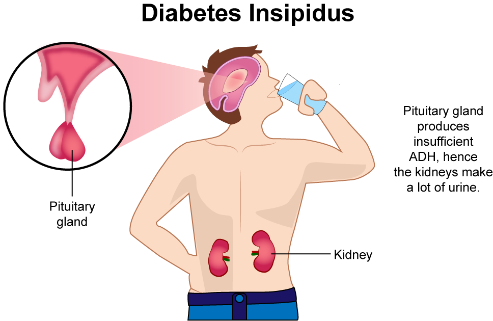Decreased secretion of antidiuretic hormone (ADH) in the posterior pituitary. It causes the client to urinate a lot and go into fluid volume deficit.