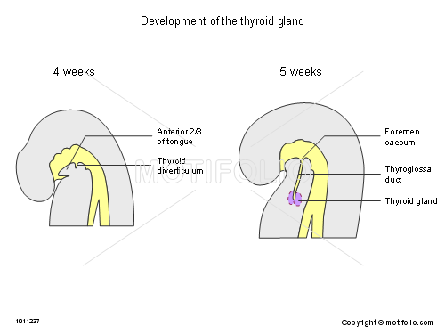 The Thyroid Gland begins as a midline invagination of pharyngeal endoderm, theThyroid Diverticulum between 3rd and 4th pharyngeal arches…It extends inferiorly from the floor of the pharynx between the median tongue bud and copula.