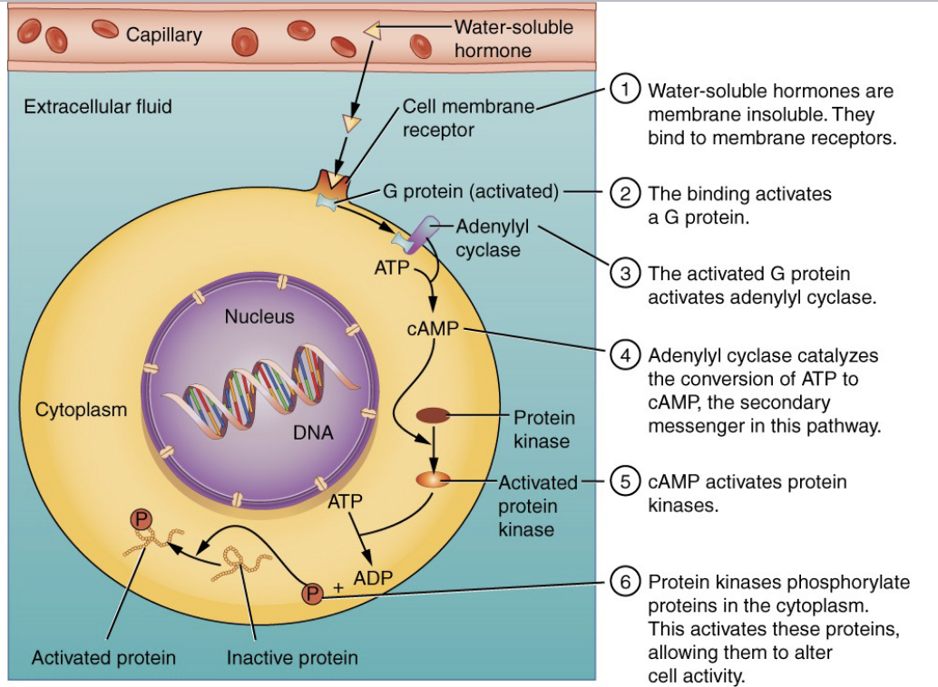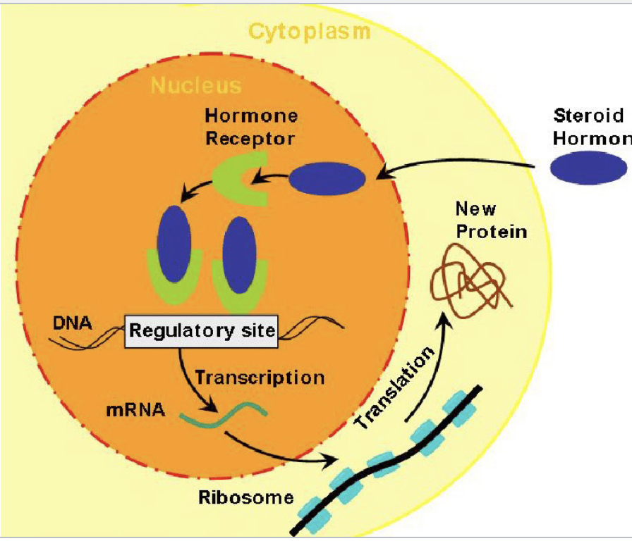 Hormone binds to a receptor, activating proteins and causing the function of the cell to change