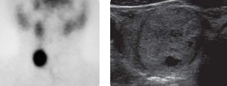Note: Mostly solid thyroid nodule that is hot on I-123 scan (nodule uptake with relatively suppressed background thyroid uptake).