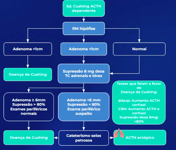 - >20: dependente = RNM hipófise// teste CRH/DDAVP e teste da dexa»_space; se alterados-resposta adequada (aumento de ACTH, supressão do eixo), doenca de cushing