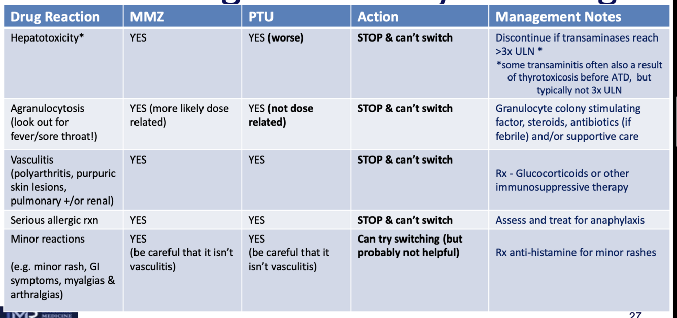 Quelles sont les effets secondaires du MMZ et du PTU et quand devrait-on les arrêter?