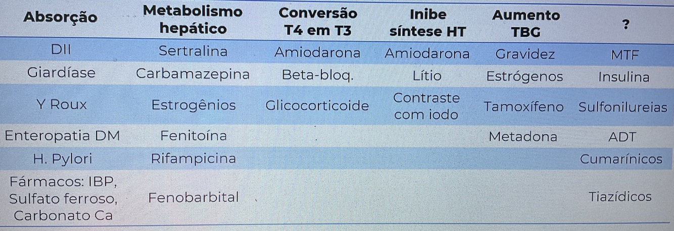 Condicoes que atrapalham a acao da levotiroxina