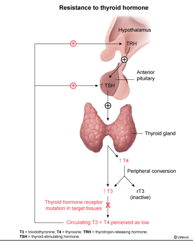 decreased sensitivty peripheral tissues to thyroid h. - receptor defect