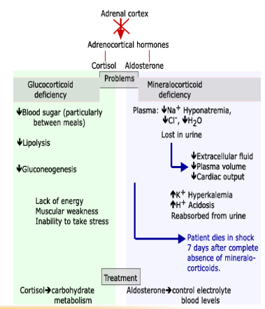 1. loss of glucocordticoid: cortisol and aldosterone