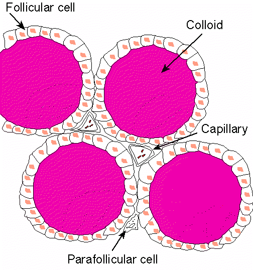 consists of follicular epithelial cells (simple cuboidal) which secrete colloid into centre