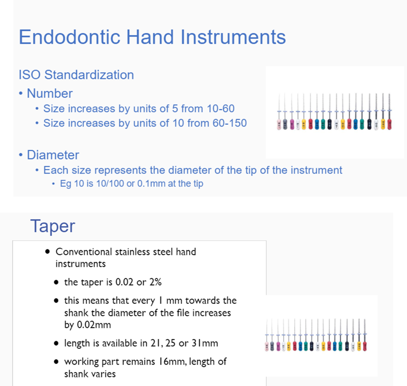 Hedstroem files – very stiff files, can only be used in up and down motion, file cuts when moved in the coronal direction. Today only used in retreatment cases to help remove gutta-percha or an overfilling of the root canal.