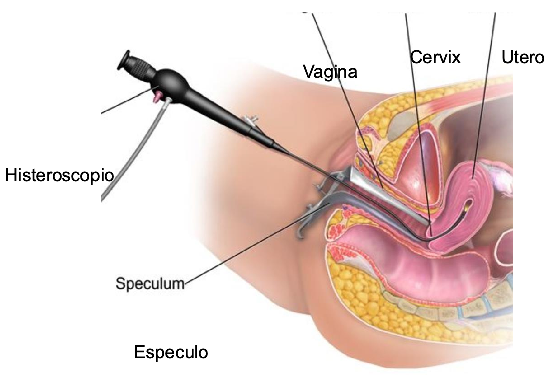 Observación del interior del útero mediante una óptica fina introducida por vagina y cuello uterino, conectada a una cámara.
