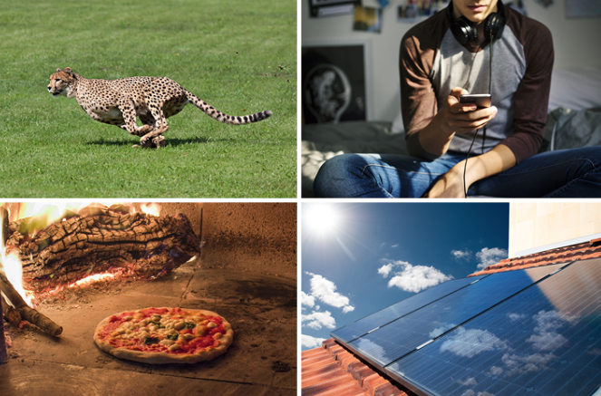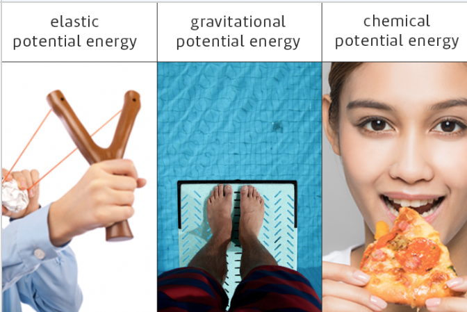 Chemical potential energy is stored in batteries, petrol, coal and food.