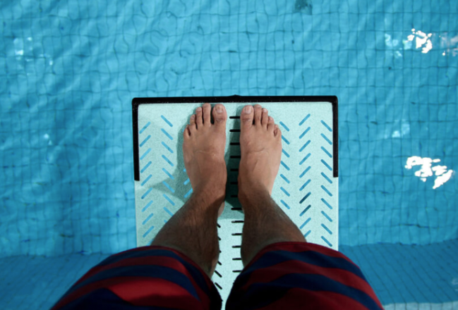 Gravitational potential energy is stored when someone climbs up to a high diving board.