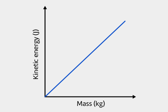 Kinetic energy and mass have a linear relationship. Doubling the mass of an object causes its kinetic energy to double.