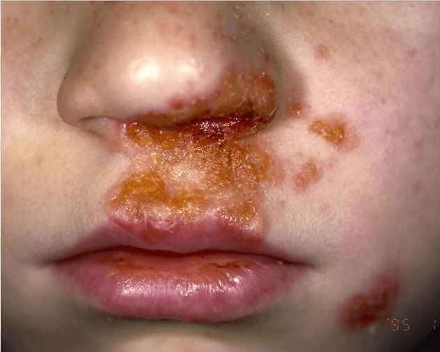 Paciente de 7 años de edad, acude a consulta con cuadro que se evidencia con pústulas de base eritematosa y costras mielicericas de ubicación peri oral.