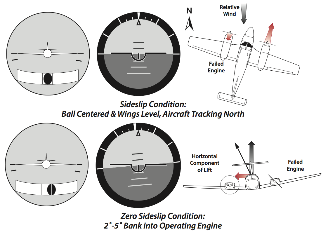 The solution to maintaining aircraft heading and reducing drag to improve performance is the Zero Sideslip Condition. When the aircraft is banked into the operating engine (usually 2 to 5 degrees), the bank angle creates a horizontal component of life. The horizontal lift component aids in counteracting the turning moment of the operating engine, minimizing the rudder deflection required to align the longitudinal axis of the aircraft to the relative wind. In addition to banking into the operative engine, the appropriate amount of rudder required is indicated by the inclinometer ball being “split” toward the operating engine side. The Zero Sideslip Condition aligns the fuselage with the relative wind to minimize drag and must be flown for optimum aircraft performance.