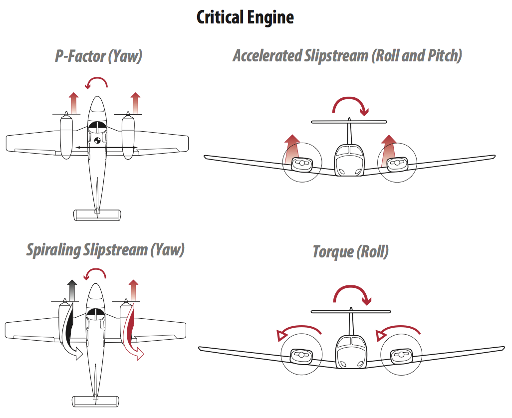 The clockwise rotation of the props contributes to the following factors that cause the left engine to be critical: