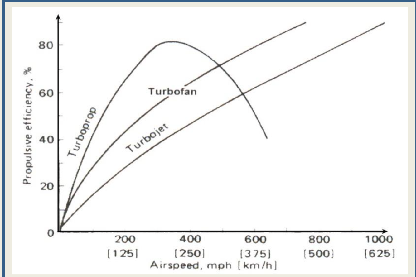 compare the propulsive efficiencies of turbojet, turbofan, turboprop, and turboshaft engines