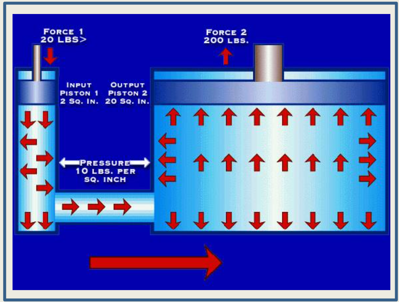if the pressure remains constant and the input piston is smaller than the output piston, the original force will be multiplied by the factor of the increase in surface area