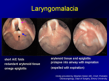 Congenital abnormality of the larynx cartilage that predisposes to dynamic supraglottic collapse during the inspiratory phase of respiration; resulting in intermittent upper airway obstruction and inspiratory stridor as larynx cartilage flops across the airway during inspiration. Most common laryngeal abnormality and cause of stridor in neonates.